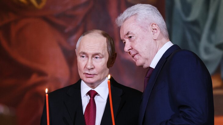 Президент России и мэр Москвы обменялись словами в ожидании возвращения крестного хода, держа в руках красные пасхальные свечи.