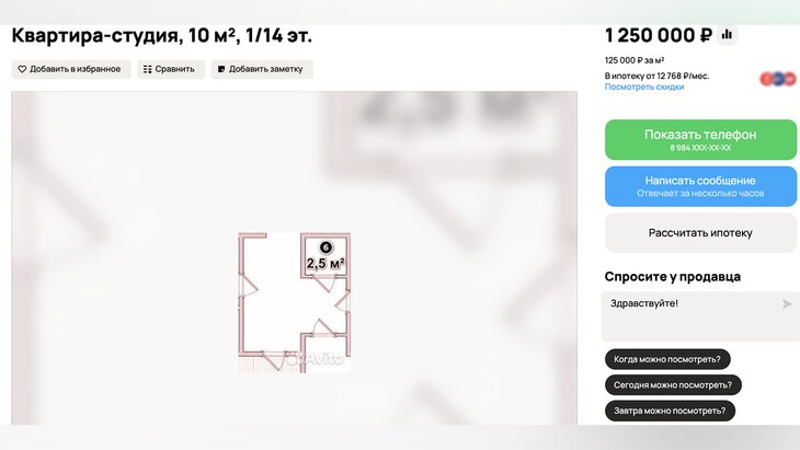 В Москве обнаружена студия площадью 2,5 "квадрата" за 1,25 млн рублей